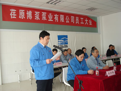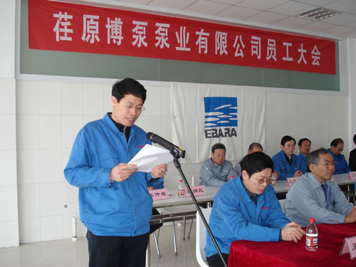 公司常務(wù)副總經(jīng)理鈴木宏先生主持大會并感謝大家經(jīng)過各方面的努力,使公司建成投產(chǎn)。人力資源部部長姜作棟先生將公司機(jī)構(gòu)設(shè)置、部門人員安排及請假制度等作了介紹;總經(jīng)理助理、公司辦公室主任劉擁民先生將公司員工行為準(zhǔn)則作了介紹;最后,總經(jīng)理孫龍平先生講話,孫總談到:荏原博泵泵業(yè)有限公司是日本荏原制作所與山東博泵科技股份有限公司的強(qiáng)強(qiáng)聯(lián)合。1912年做為泵的制造商起家,隨后發(fā)展成為工業(yè)機(jī)械界帶頭企業(yè)的日本荏原以其雄厚的技術(shù)實(shí)力,成為世界最大的單一泵制造廠家。而成立于1929年的山東博泵科技股份有限公司,在70多年專業(yè)生產(chǎn)水泵的基礎(chǔ)上,成為中國泵行業(yè)的佼佼者,并建立了遍布全中國的銷售網(wǎng)絡(luò)。荏原博泵泵業(yè)有限公司的建成投產(chǎn),將在優(yōu)勢互補(bǔ)的基礎(chǔ)上,發(fā)展成為高科技、高品質(zhì)的世界級一流企業(yè)。